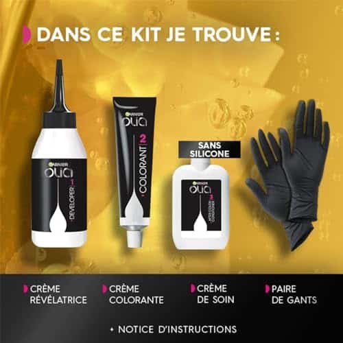 Le paquet comprend une boîte de coloration permanente Garnier Olia en châtain pur (4.0), des gants, une bouillote, du lait révélateur, de la crème colorante, un traitement et une notice d’utilisation.