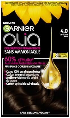 Couleur cheveux 2024 « Olia Garnier Châtain Pur – Coloration Permanente Sans Ammoniaque enrichie en Huiles Naturelles de Fleurs (4.0) »
