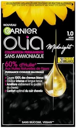 Couleur cheveux 2024 « Olia Noir Absolu 1.0 : Coloration Permanente sans Ammoniaque aux Huiles de Fleurs Naturelles par Garnier »