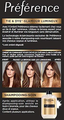 L’ombré de L’Oréal Paris Préférence offre un dégradé glamour et lumineux, avec un éclaircissement des longueurs et pointes. Il convient aux cheveux châtains clairs à châtains. Son utilisation offre un résultat expert avec des contrastes saisissants et des longueurs illuminées, le tout résistant à plusieurs lavages.