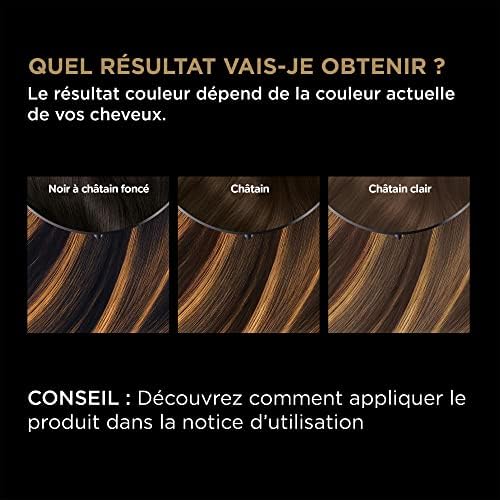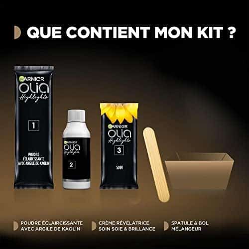 Pour l’application, mélangez le contenu des sachets pour obtenir un résultat homogène. Appliquez-le sur les mèches de cheveux secs, laissez poser pendant 30 minutes, rincez abondamment et terminez par l’application d’un soin. Dans le coffret, vous aurez un Garnier Olia Highlights.