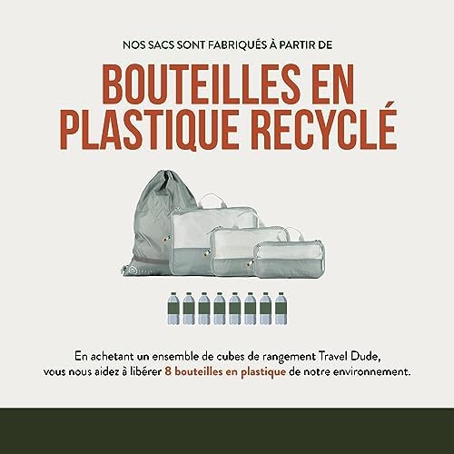 De plus, l’acquisition de ces produits TRAVEL DUDE contribue à la réduction des déchets plastiques dans notre environnement. En effet, ces cubes de rangement sont fabriqués à partir de bouteilles en plastique recyclées.
