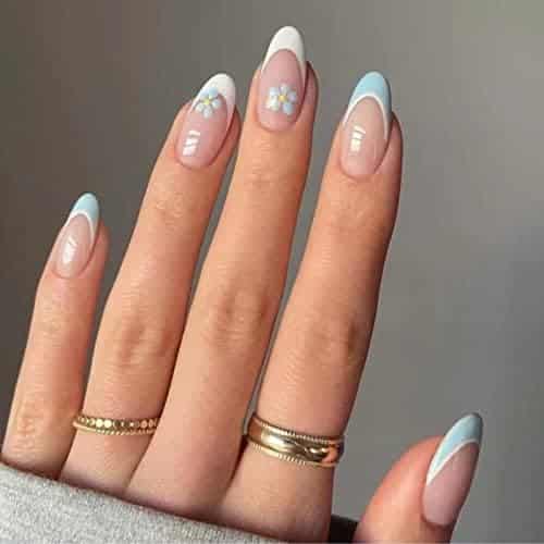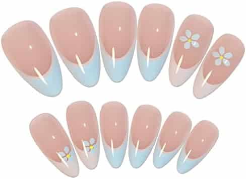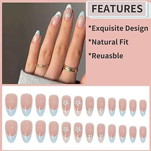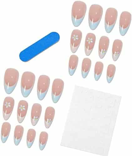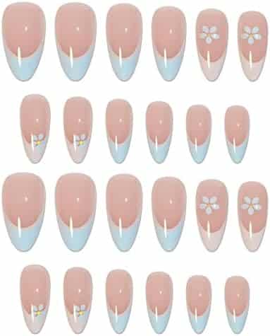 Summer nails « French Tips RUNRAYAY – Faux Ongles Nude & Fleurs Bleues pour Femmes et Filles »