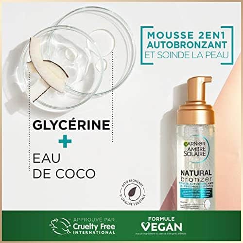 La formule de cette mousse autobronzante est enrichie en eau de coco et en glycérine, qui contribuent à l’hydratation de la peau. En plus d’être rapide à sécher, elle ne laisse pas de traces sur la peau ou les vêtements.